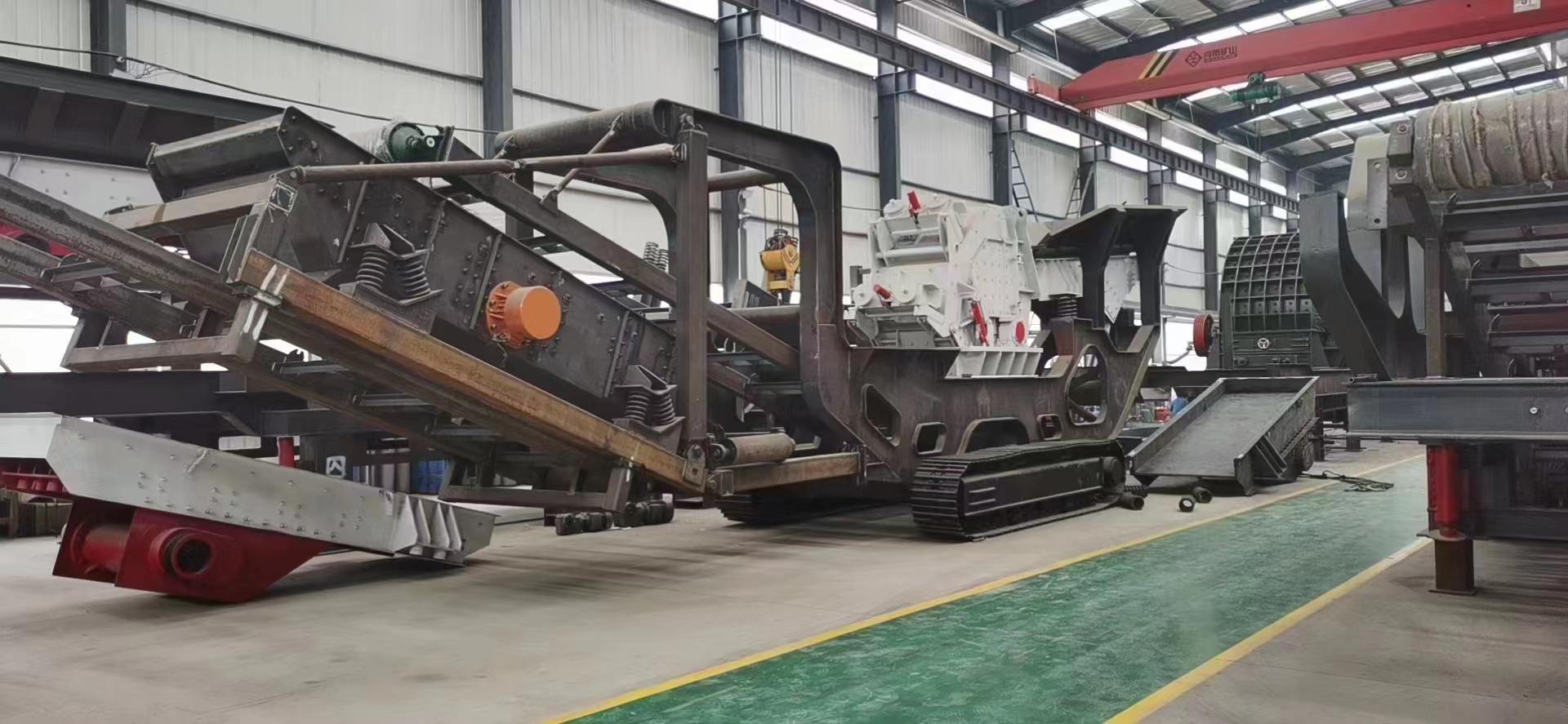 The crawler type mobile crushing station is composed of crawler chassis, frame assembly, main machine and auxiliary equipment, power system and hydraulic electric control system. When moving, power is provided by the power system, and the crawler chassis is driven by the hydraulic and electric control system; During installation, the power system controls and drives the hydraulic cylinder through the hydraulic electric control system to automatically complete the equipment installation; During operation, the power system drives and controls the main machine and auxiliary equipment through the hydraulic and electric control system. The materials enter the main machine mounted on the crawler chassis and frame from the silo for crushing or screening, and are discharged through the integrated belt conveyor.